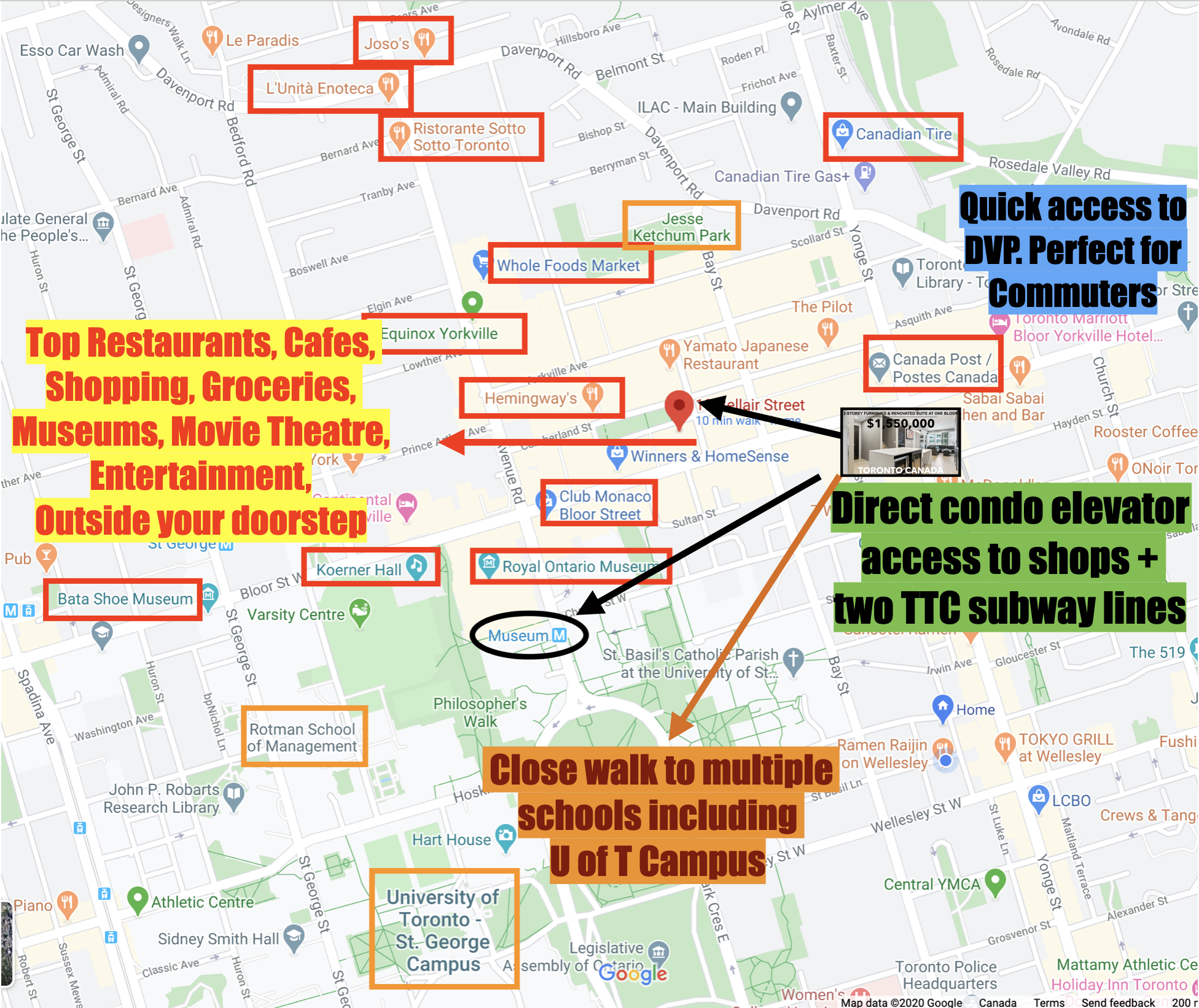 ✅ Prime downtown location with all the conveniences within close walking distance! A perfect 100 Walkscore! Direct elevator access to TTC, connecting you to two subway lines without walking outdoors! Right outside your doorstep is Yorkville, downtown Toronto's most affluent neighbourhood, and an excellent selection of restaurants, cafes, shopping, entertainment, & much more.