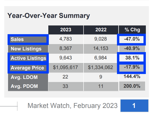*on average, properties priced below $1M will receive more buyer showings and are more likely to sell in a timely manner. Some mid range properties and especially higher end luxury properties are likely to experience a considerable length of time on the market and/or are unable to sell. With significantly higher ownership costs due to the current mortgage rates, sales volumes are down -47% compared to early last year and the majority of properties that are selling are below $1M in price. February saw a +19% increase in properties that sold below $1M. Thus, while this market is more favourable for entry level priced homes, if you are selling a mid range or luxury property, assess the feedback from buyer showings within the first 1-2 months on the market. If your property is receiving less than 10 showings a month with no offers, be open to changing your strategy in order to get the property sold. This might require (i) adjusting the price to market demands or (ii) making certain upgrades/repairs in order for prospective buyers to come forward with an offer close to your list price or (iii) taking the property off the market and re-listing it for sale when the market recovers, while renting it out in the interim to help cover the costs of ownership.