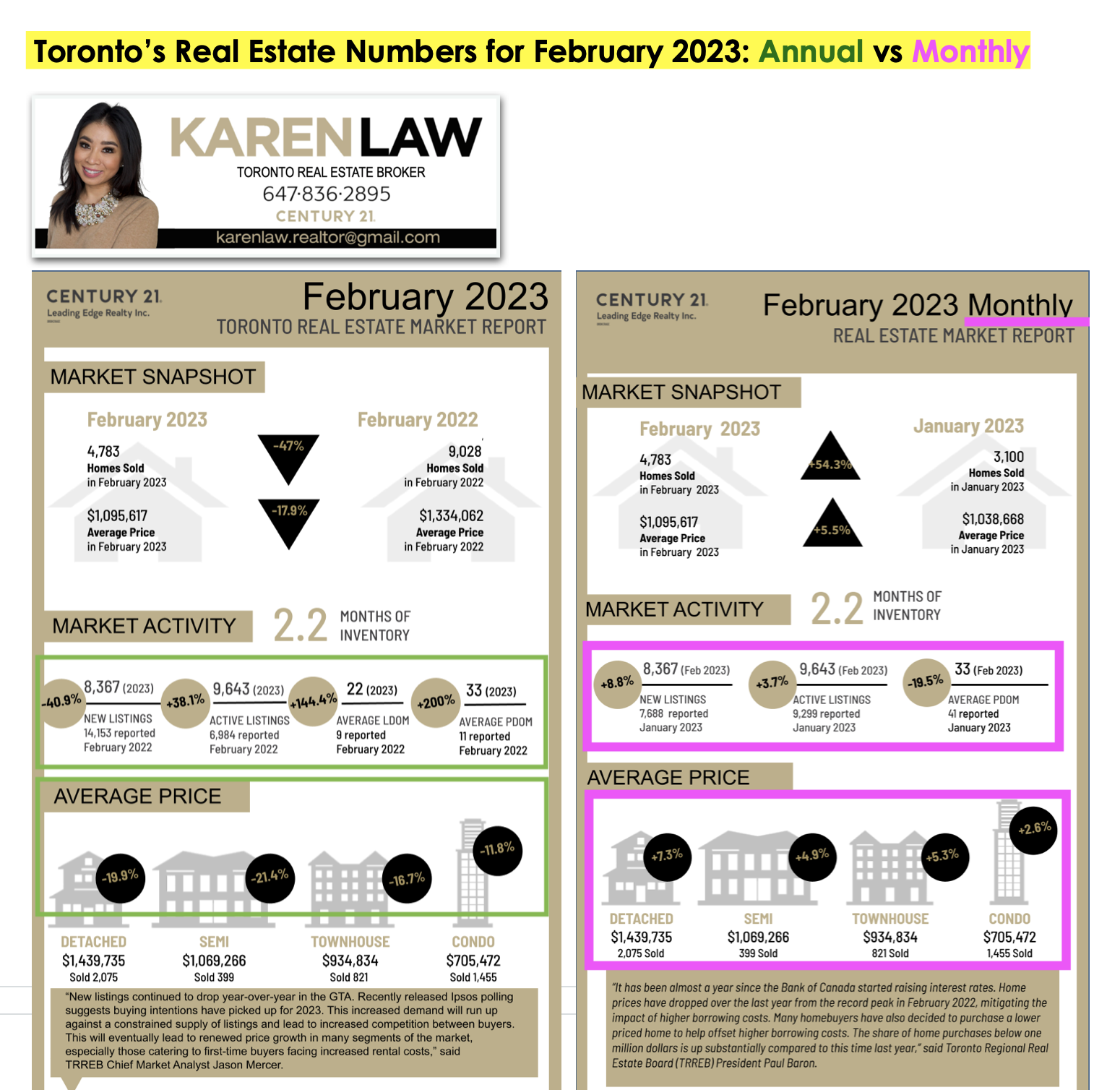 While an annual comparison of the latest housing numbers in the Greater Toronto Area (GTA) indicates an ongoing trend of softened home prices and slower sales volumes throughout the month of February, February did see a +5.5% increase in average home prices compared to the previous month January 2023. Seasonally, it is normal to see a slight uptick in February sales volumes and home prices.