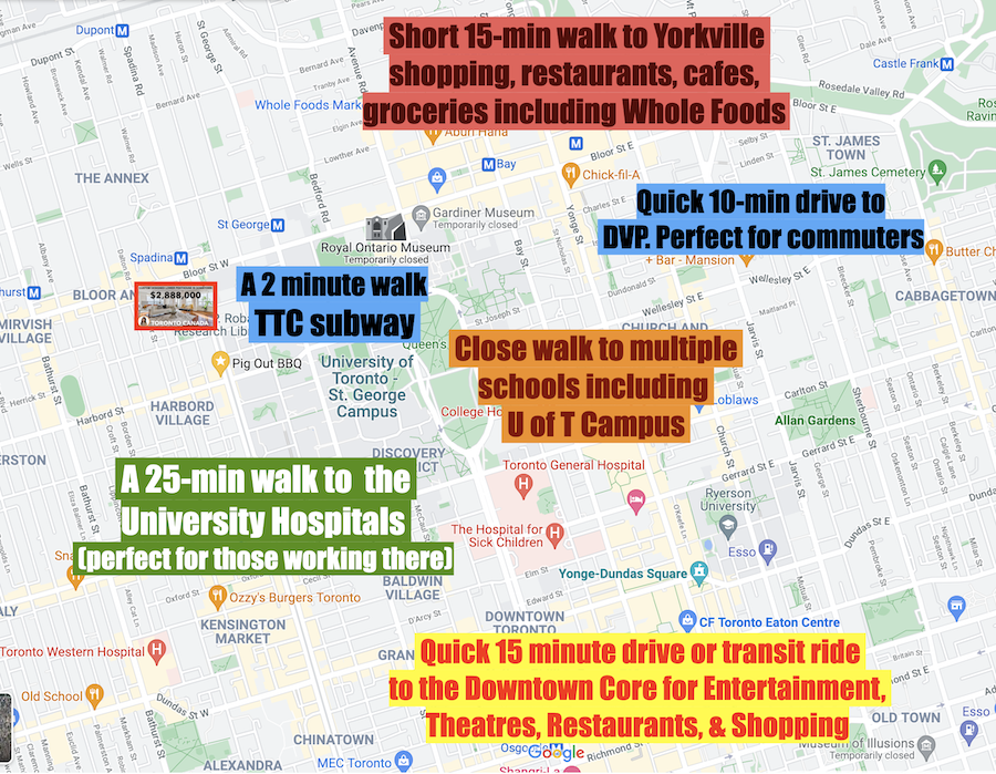 The condo is situated in a vibrant community with many amenities all within close walking distance: right across the street to TTC Spadina subway station for a convenient commute, green space nearby including Matt Cohen park across the street🌳, a 10-minute walk to the University of Toronto downtown campus, numerous restaurants and shops surrounding, and a 15-minute walk to Yorkville and the ROM.