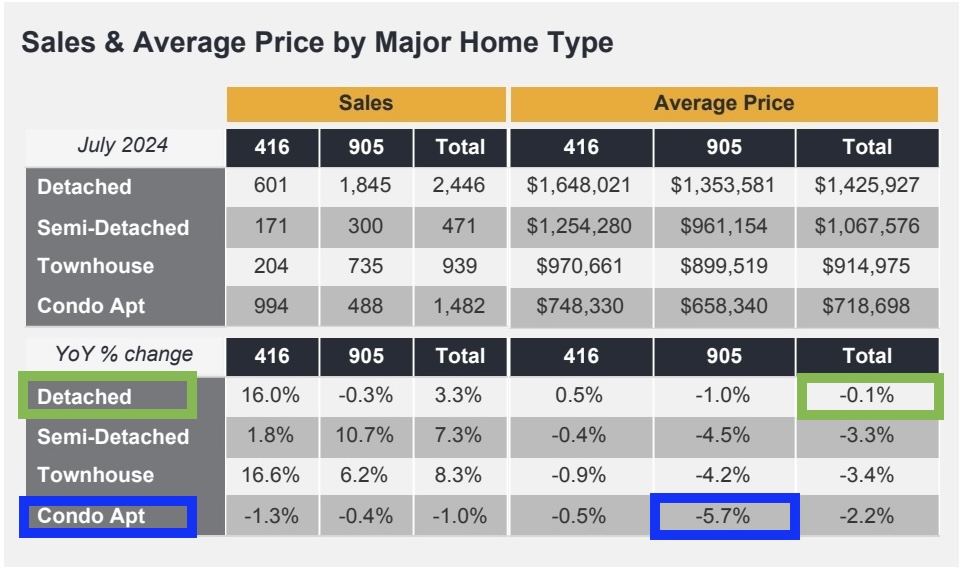 ✨ Annual Price Trends: in July 2024, the average GTA home price dipped slightly by -0.9% year-over-year, settling at $1,106,617. This continues the trend seen in May and June, where all housing types recorded modest declines. However, detached homes in Toronto bucked the trend with a slight +0.5% increase. The steepest drop was in suburban condos, which faced a -5.7% price decrease